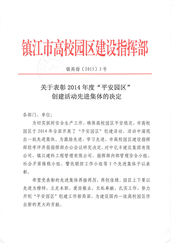 祝賀鎮(zhèn)江建科工程管理有限公司獲2014年度鎮(zhèn)江市高校園區(qū)“平安園區(qū)”創(chuàng)建活動先進集體表