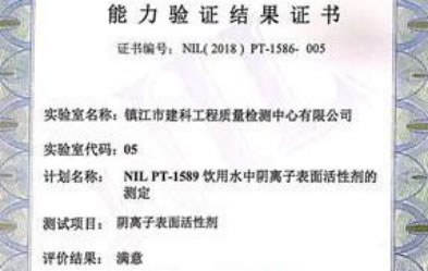 2018年10月,檢測三科參加了由CNAS組織實施的“NILPT-1586飲用水中陰離子表面活性劑的測定”能力驗證,評價結(jié)果為“滿意”。