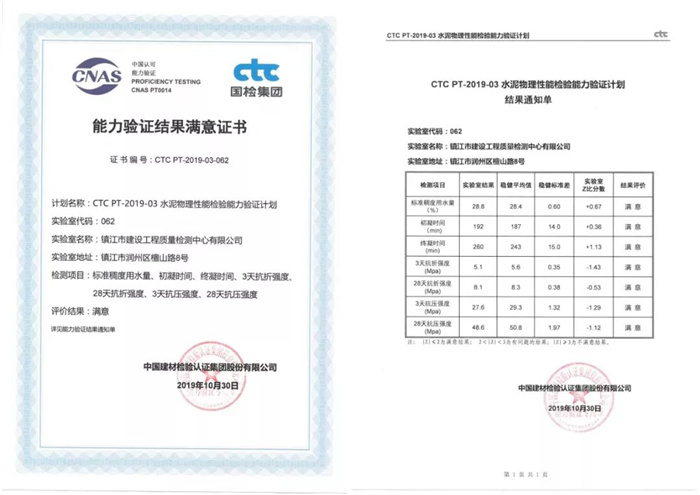 我中心于2019年6月至8月參加了由中國建材檢驗認證集團股份有限公司組織的CTC PT-2019-03水泥物理性能檢驗能力驗證--全國性比對,我中心的檢測結果為滿意,順利通過了此次能力驗證。
