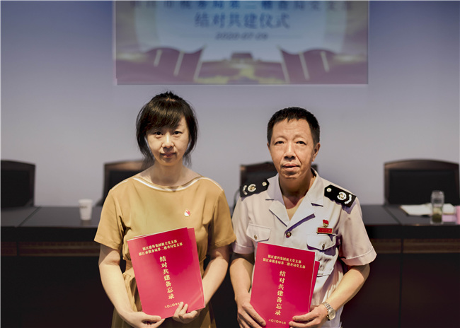 鎮(zhèn)江建科集團機關(guān)黨支部書記周梅與第二稽查局黨支部書記陳康共同簽署并互換備忘錄,雙方與會代表合影留念。