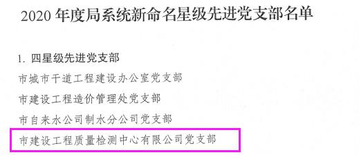2020年12月,鎮(zhèn)江市建設(shè)工程質(zhì)量檢測(cè)中心有限公司黨支部通過鎮(zhèn)江市住建局系統(tǒng)“四星級(jí)”黨支部評(píng)定,這是上級(jí)黨委對(duì)檢測(cè)中心作為非公經(jīng)濟(jì)黨支部開拓創(chuàng)新黨建工作取得成效的肯定。