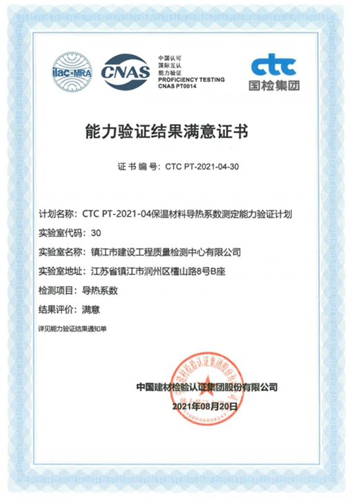 檢測中心于2021年6月均參加了由中國建材檢驗認證集團股份有限公司組織的“CTC PT-2021-04保溫材料導熱系數測定能力驗證 計劃”(全國性比對),提交的導熱系數檢測結果滿意,順利通過了此次能力驗證。