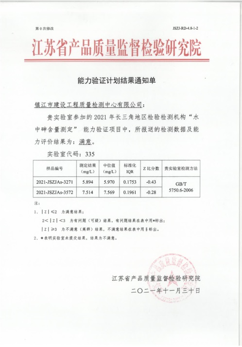 為加強檢驗檢測機構監(jiān)督管理,推動長三角檢驗檢測高質(zhì)量一體化發(fā)展,蘇滬浙皖市場監(jiān)管局聯(lián)合組織開展了2021年長三角地區(qū)檢驗檢測機構能力驗證工作。檢測中心參加了能力驗證項目“水中砷的測定”,提交的結果評價為“滿意”。
