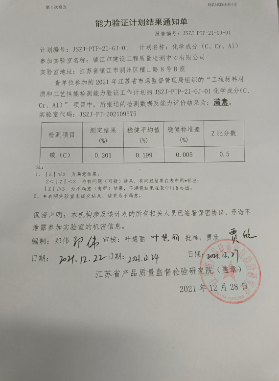 2021年10月,檢測中心參加了由江蘇省市場監(jiān)督管理局組織的工程材料材質(zhì)和工藝性能檢測能力驗(yàn)證-化學(xué)成分能力驗(yàn)證計(jì)劃(JSZJ-PTP-21-GJ-01)。本計(jì)劃由江蘇省產(chǎn)品質(zhì)量監(jiān)督檢驗(yàn)研究院/國家工程復(fù)合材料產(chǎn)品質(zhì)量監(jiān)督檢驗(yàn)中心負(fù)責(zé)實(shí)施。對鋼樣中碳元素的含量進(jìn)行檢測,提交的檢測結(jié)果評價(jià)為“滿意”,順利通過此次能力驗(yàn)證。