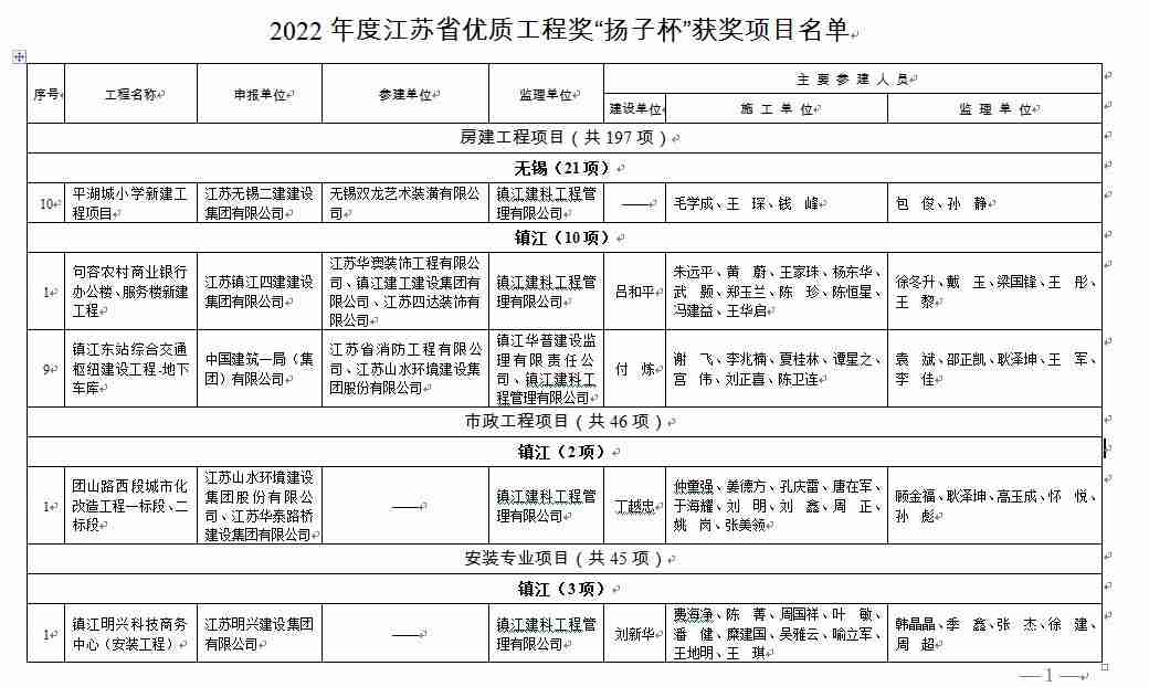 管理公司上半年喜獲2022年度江蘇省優(yōu)質(zhì)工程獎“揚子杯”5項,其中房建工程項目3項:無錫平湖城小學新建工程項目(管理公司承監(jiān)的首個外地獲獎項目)、句容農(nóng)村商業(yè)銀行辦公樓服務(wù)樓新建工程、鎮(zhèn)江東站綜合交通樞紐建設(shè)工程-地下車庫;市政工程項目1項:團山路西段城市化改造工程一標段、二標段工程;安裝工程項目1項:鎮(zhèn)江明興科技商務(wù)中心安裝工程。另外中海南京鎮(zhèn)江潤江府項目、句容福地路小學新建工程2個項目榮獲了2022年度江蘇省“標準化監(jiān)理項目”,以上獲獎數(shù)量位居全市前列。